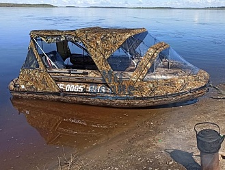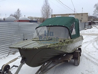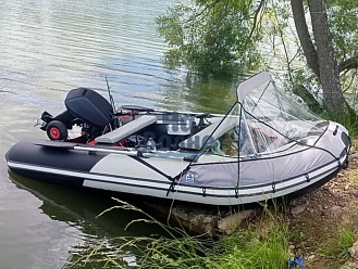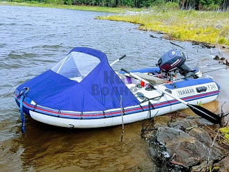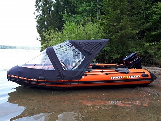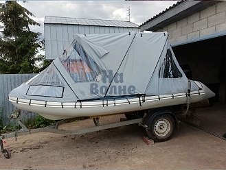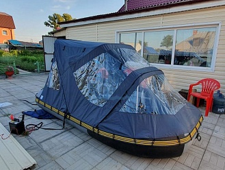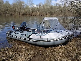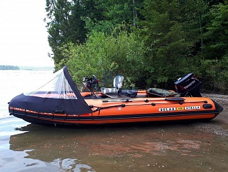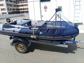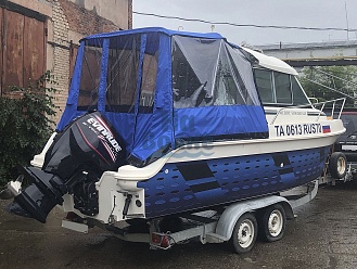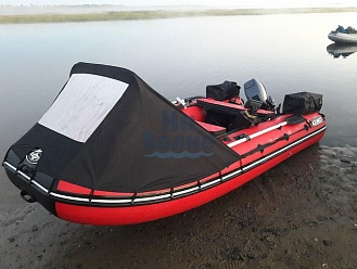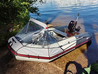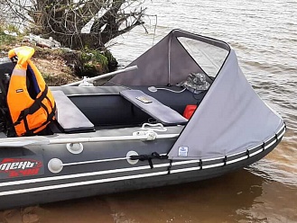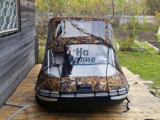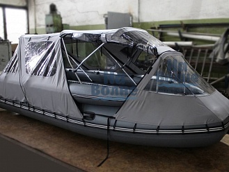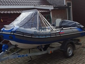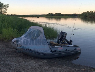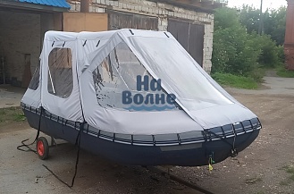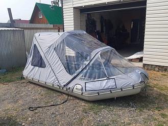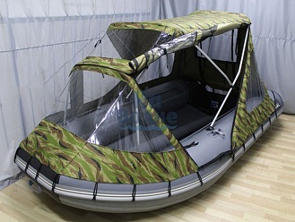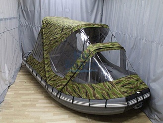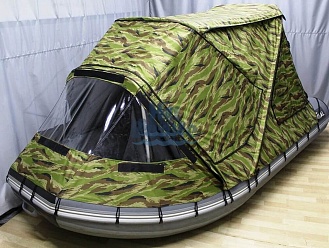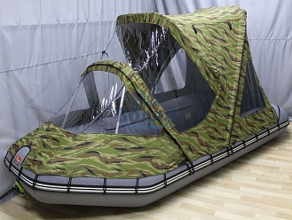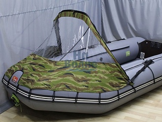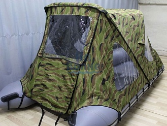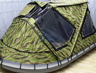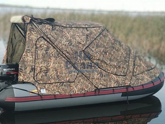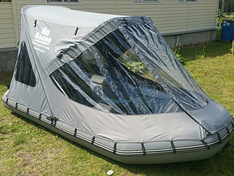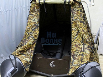 Тент с задней дверью для выхода к мотору, небольшими боковыми окнами и усиленными краями для установки застёжек. Изготовлен из специализированной тентовой ткани Оксфорд 600 повышенной плотности