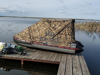 Полноценный ходовой тент на основе комбинированного тента и тента трансформера. Особенностью является наличие люка-бойницы в крыше для охоты из лодки